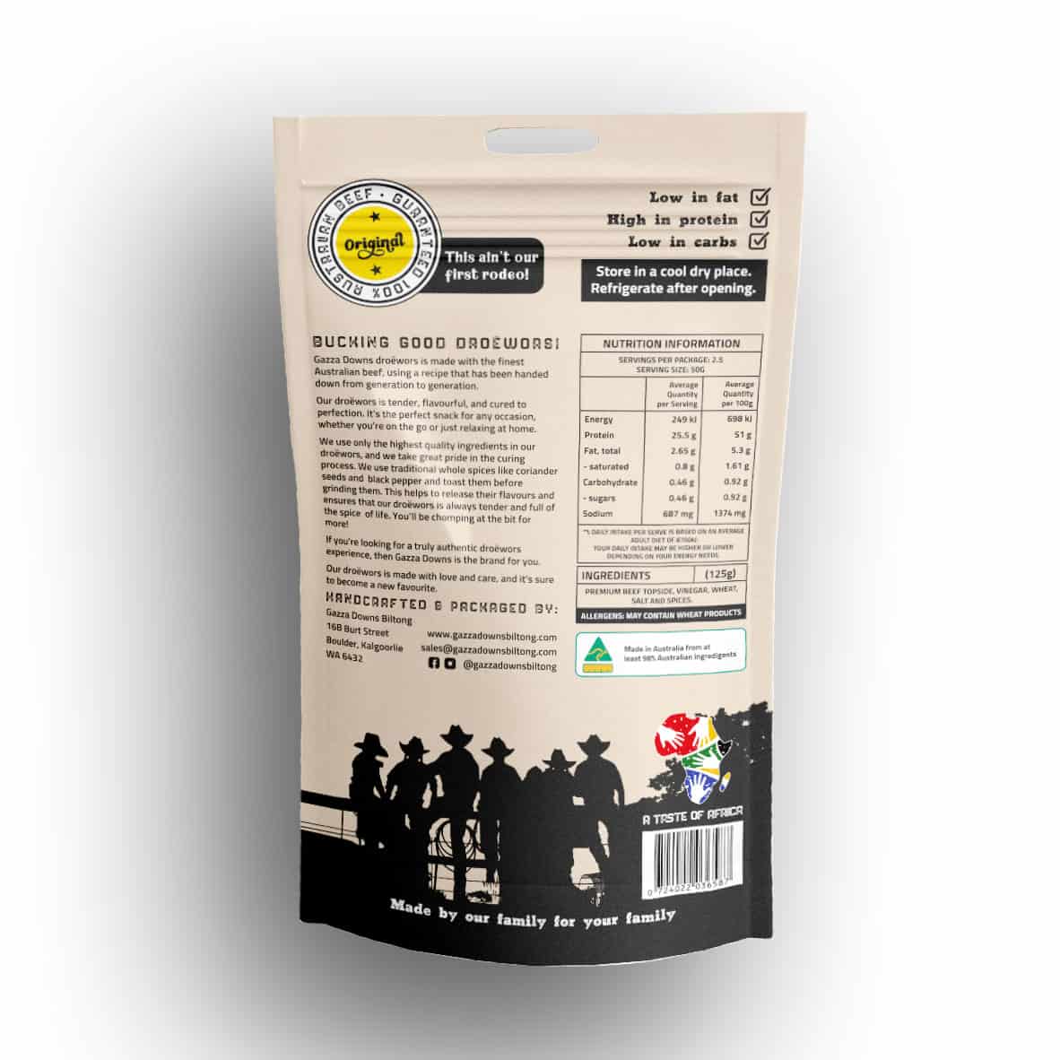 With every bite of Gazza Downs Original Droëwors, you’ll experience the rich culinary heritage of South Africa. Its savoury, chewy texture and traditional spice blend will transport you to the heart of the country, where flavour and tradition come together.
